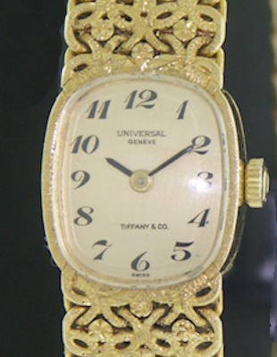 Most intricate filigree style 18kt gold bracelet on this refined dress manual wind gold model by Universal Geneve for Tiffany & Co.