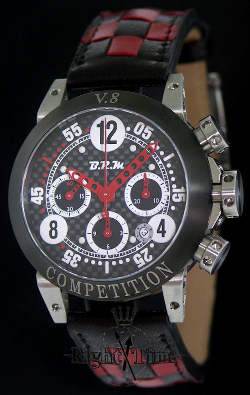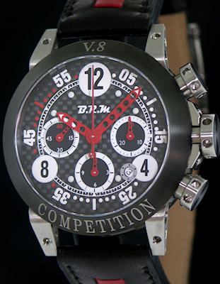 B.R.M. Bernard Richards Manufacture V8-44-Campione Racing chronograph. ETA automatic 7753 movement. Stainless steel case. Black dial with "Race" style numbers. Black leather band.