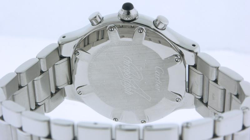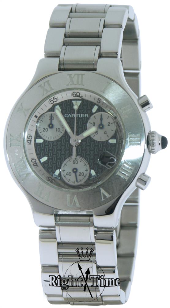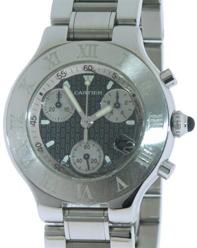 Gentlemen`s Cartier 21 Chronoscaph Swiss made quartz chronograph model 2424 with dark grey Cartier pattern dial and silver color chronograph registers sub-dials. All stainless steel band
