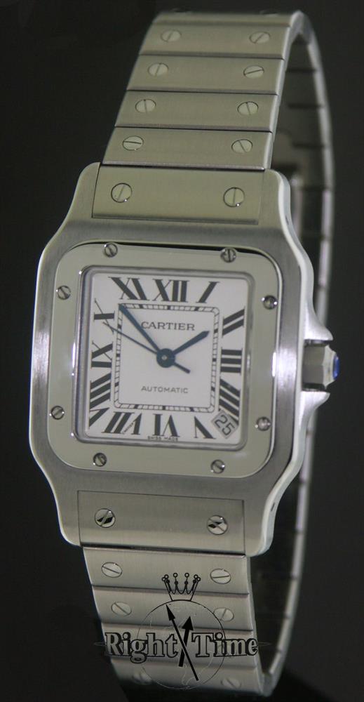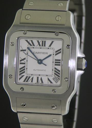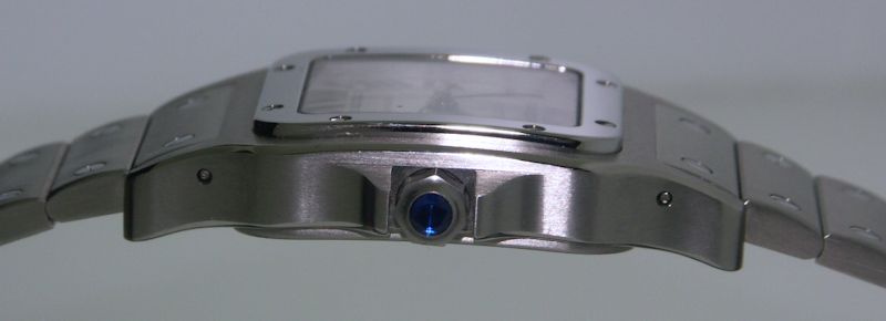 Stainless steel Cartier "Santos Galbee XL" Swiss automatic. Dimensions: 41 x 29 mm case, octagonal crown with blue sapphire cabochon and protective horns; sapphire crystal, back secured with eight screws, water-resistant to 3 atm.