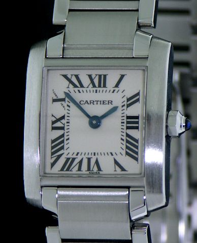 Cartier small-size quartz "Tank Francaise", Roman printed numerals, stainless steel square style case (25x20mm) and Cartier bracelet with deployant clasp