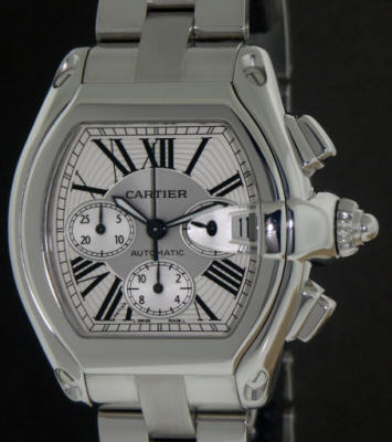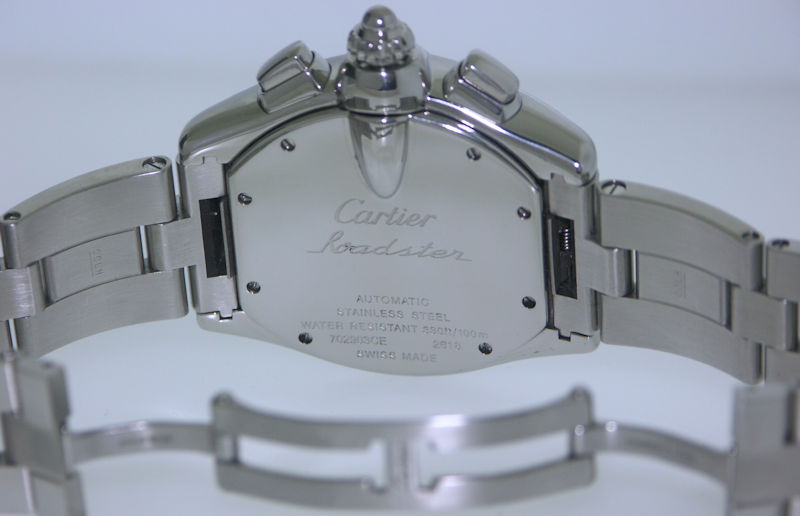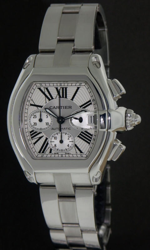 Extra Large Cartier Roadster automatic Chronograph model with rugged 47.5mm stainless steel case on bracelet with deployant clasp, luminescent filled hands, #8510 Caliber self-winding mechanical movement with date calendar, scratch-resistant sapphire crystal, water resistant to 100 meters.