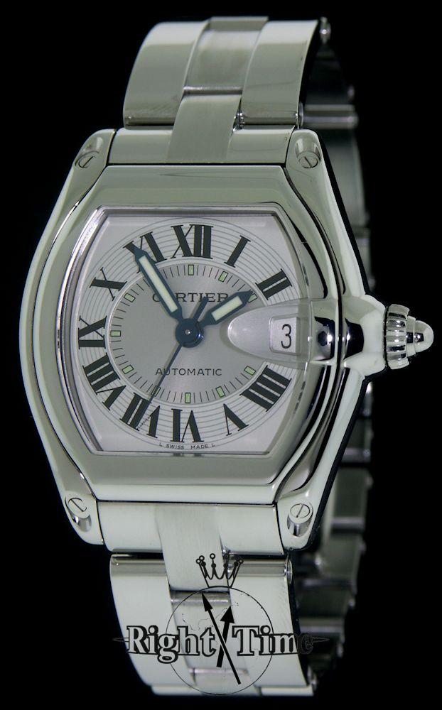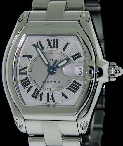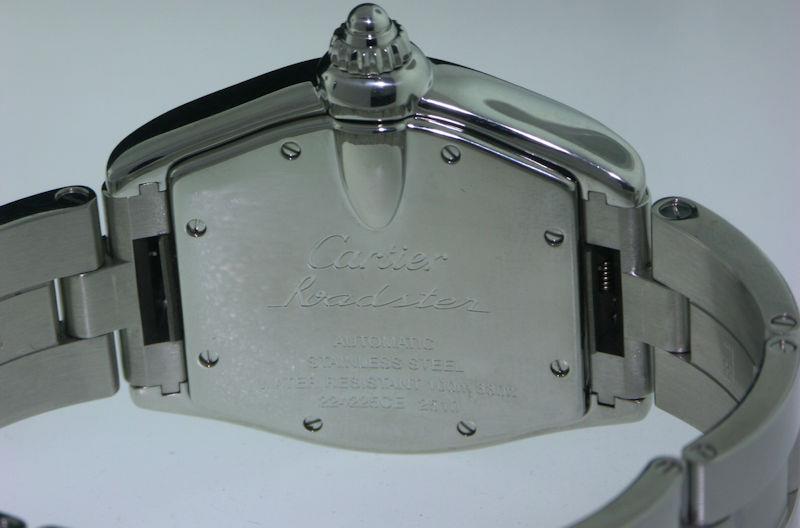 Large mens automatic Cartier "Roadster" model with silver circular guilloche dial, blued hands with luminescent coating, original factory box and interchangeable quick release bands: steel and leather