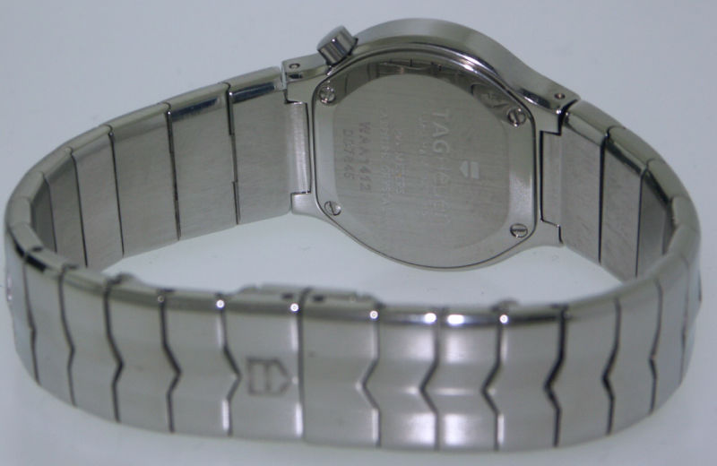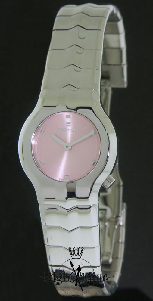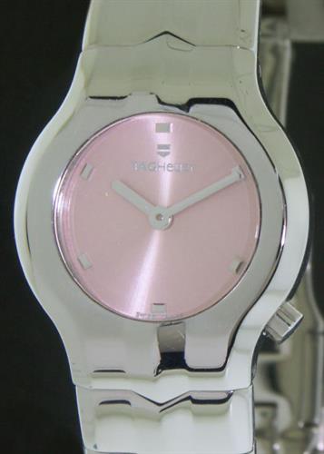 Ladies dressy sport Swiss quartz WAA1412.BA0760 model by Tag Heuer from the "Alter Ego" collection. This all polished stainless steel watch has a pretty pink/salmon color dial with silver hands and markers.
