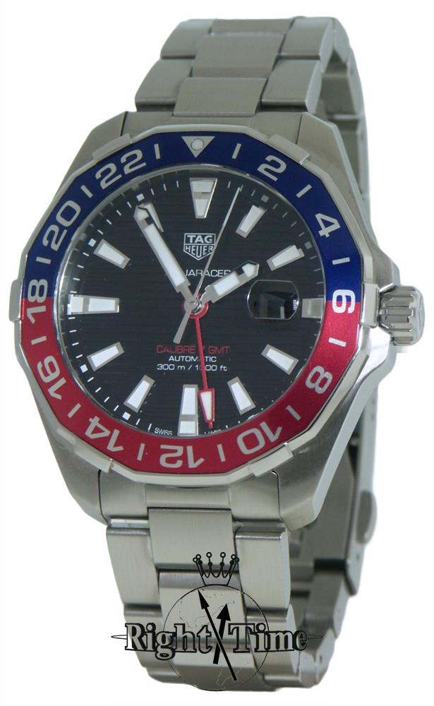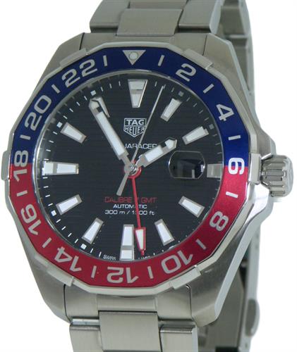 Tag Heuer Aquaracer GMT automatic model WAY201F.BA0927. Solid stainless steel case and bracelet. Black textured dial with luminous hands and markers. Duo-directional bezel with aluminum 24hour "Pepsi" blue and red insert. Swiss made Caliber 7 automatic movement. Diver rated to 300meters. Sapphire scratch resistant crystal.
