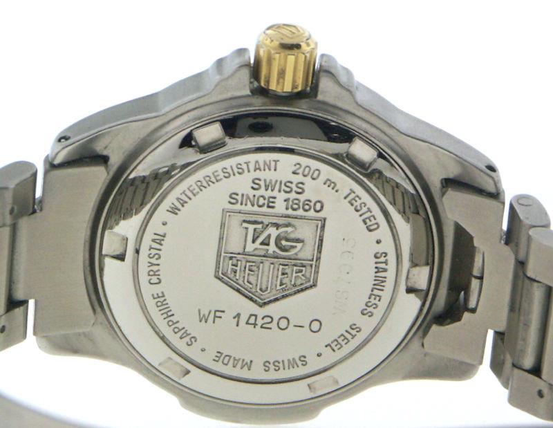 Tag Heuer Ladies 4000 series Professional watch. Solid stainless steel case & bracelet. White dial with gold tone bezel and hands/markers. Swiss made Quartz analog movement. Water resistant to 200 meters. Sapphire crystal.