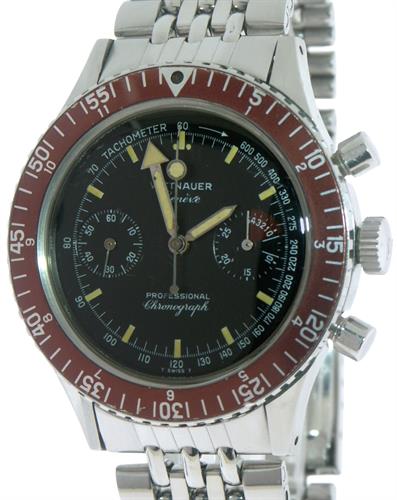 Wittnauer Professional Chronograph manual wind watch in steel case with original factory beads of rice style bracelet, powered by Valjoux 7733 movement, evenly patinaed tritium dial and hands