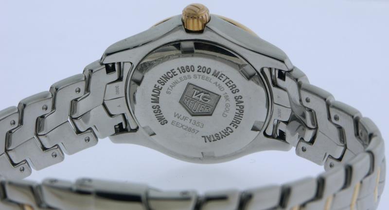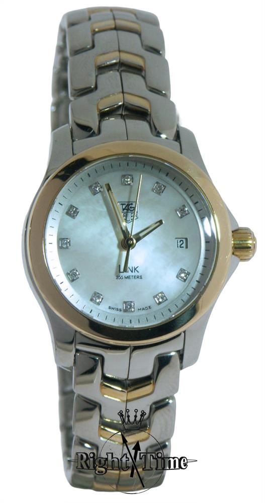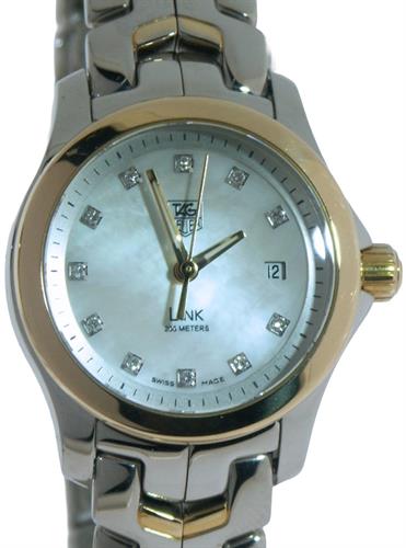 Tag Heuer Link model WJ1319.BA0572. Swiss made quartz analog movement. High polished stainless steel case and bracelet. Uni-directional polished stainless steel 60 minute bezel. Brilliant mother of pearl dial with diamond markers and polished steel tone hands. Sapphire crystal.