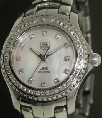 Tag Heuer Link sport drerss model WJ131A. 200 meters water resistant. Polished stainless steel case and watch bracelet. Diamonds on the bezel and at the hour marks on white mother-of-pearl dial. Quartz movement with date calendar.