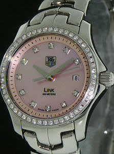 Tag Heuer Link WJF131E. 200 meters water resistant. Polished stainless steel case and watch bracelet. Diamonds on the bezel and pink Mother-of Pearl dial. Quartz movement with date calendar. Consigned time piece. Like new condition.