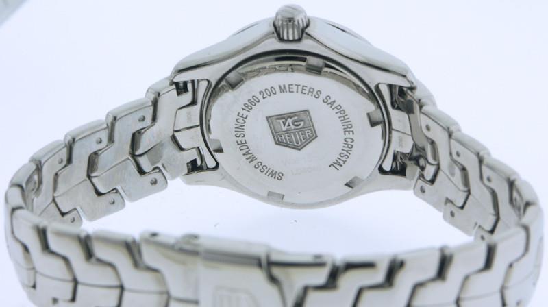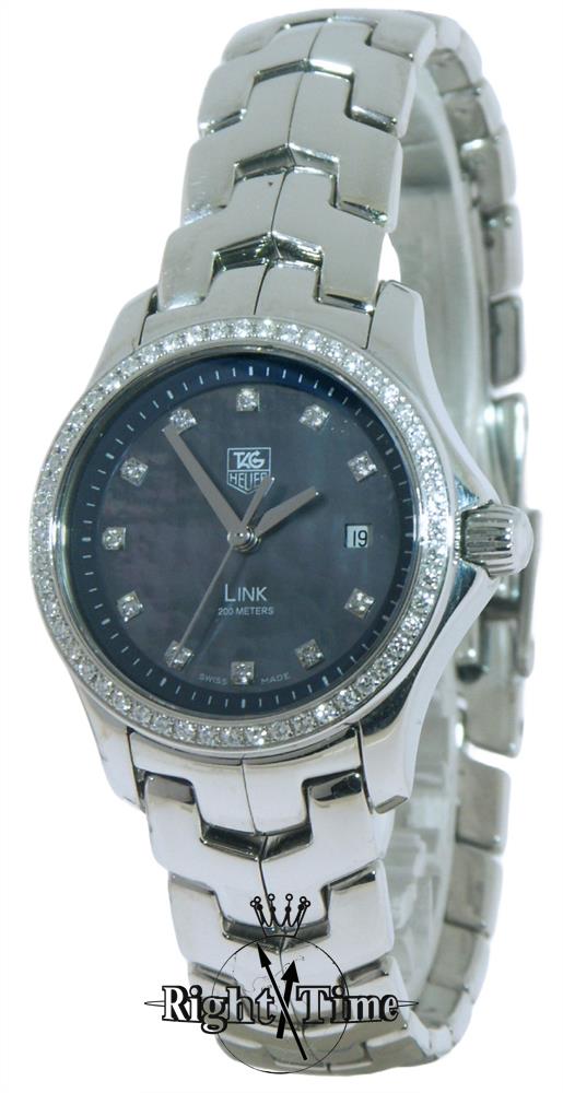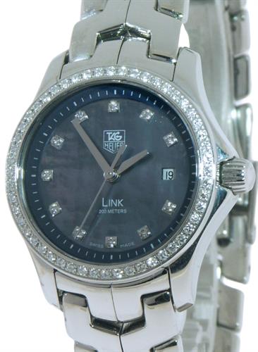 Tag Heuer Link WJF131G.BA0572. 200 meters water resistant. Polished stainless steel case and watch bracelet. 63 full cut Wesselton Diamonds on the bezel and dark blue genuine mother-of-pearl textured dial with diamond markers. ETA Quartz movement with date calendar.