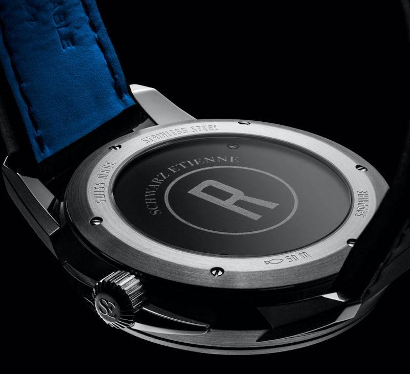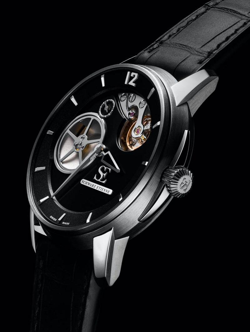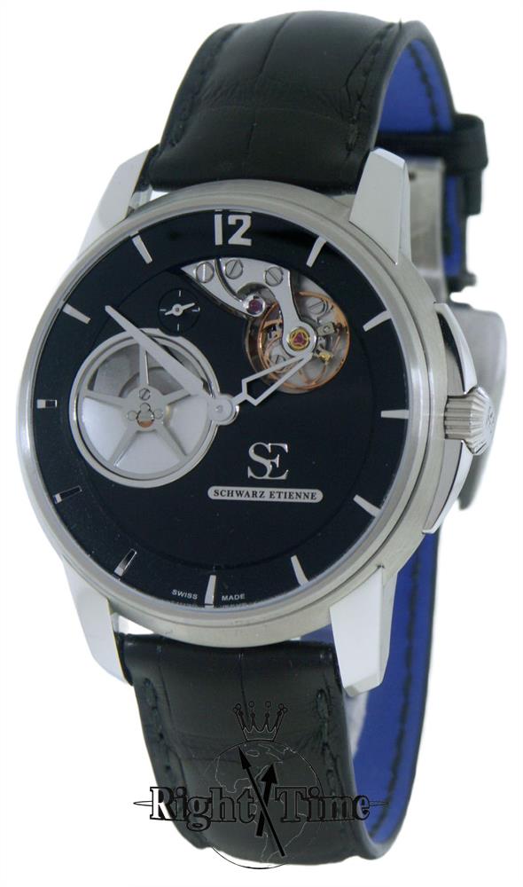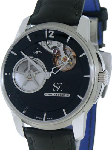 Schwarz Etienne Roswell Collection. Watch model WRW20TJ01SS01AA powered by in-house made automatic "Irreversible" ISE 100.00 movement with decentered micro rotor. Black partially skeletonized dial with small seconds sub-dial at 11 o`clock. Steel case with black alligator leather band