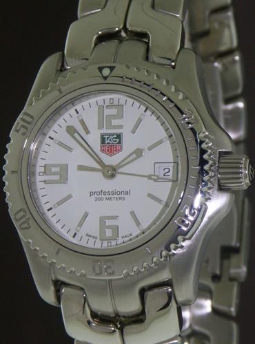 Tag Heuer "Link" professional sport. White dial and large unique polished applied Arabic numerals and markers. Swiss quartz movement. Sapphire crystal. 200 meters water resistant.