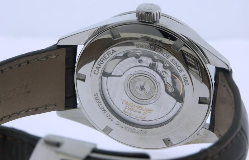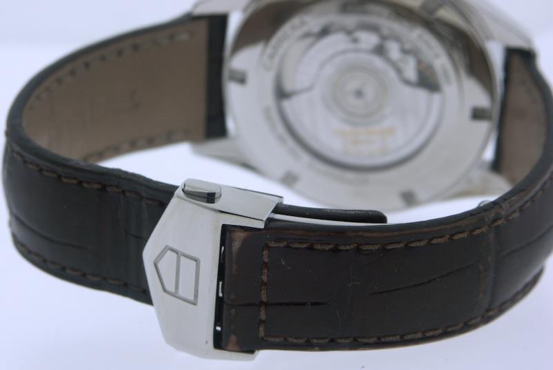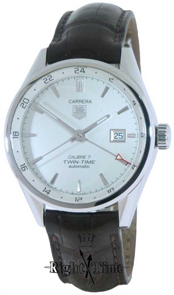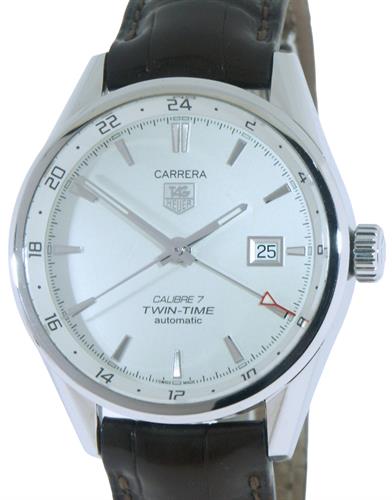 Tag Heuer Carrera Twin-Time watch model WAR2011.FC6291 powered by ETA2893-2 automatic movement with date and second time zone. Polished stainless steel case, silver color dial with steel luminous hands and hour markers, scratch resistant sapphire crystal, brown crocodile strap.