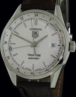 Tag Heuer Carrera Twin-Time watch model WV2116.FC6181 powered by Swiss made Tag Heuer Calibre 7 automatic movement with date and second time zone. Polished stainless steel case, silver color dial with steel luminous hands and hour markers, scratch resistant sapphire crystal.