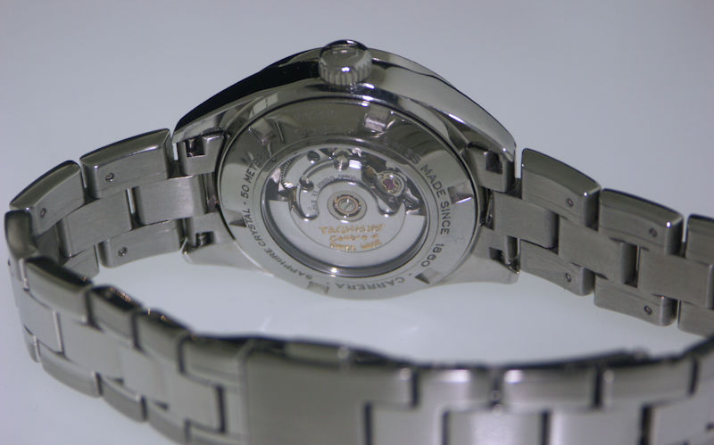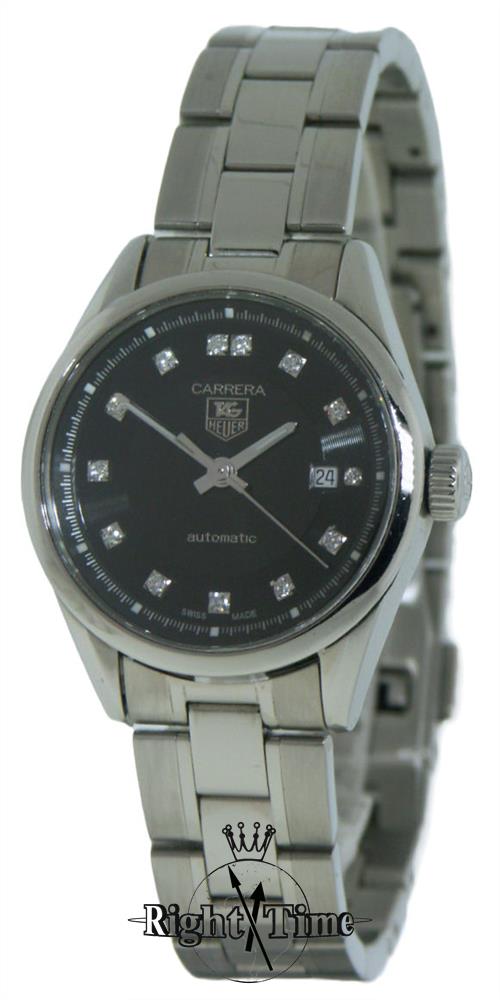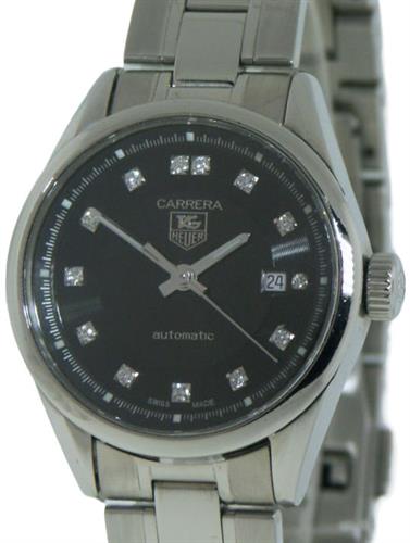Tag Heuer ladies "Carrera," model WV2410.BA0793. Swiss made Tag Heuer Calibre 4 Automatic movement. Solid stainless steel case and bracelet surround a flat black dial w/13 stunning top Wesselton diamond markers. Slightly domed sapphire crystal on top with observation crystal on the caseback. Water resistant to 50 meters.