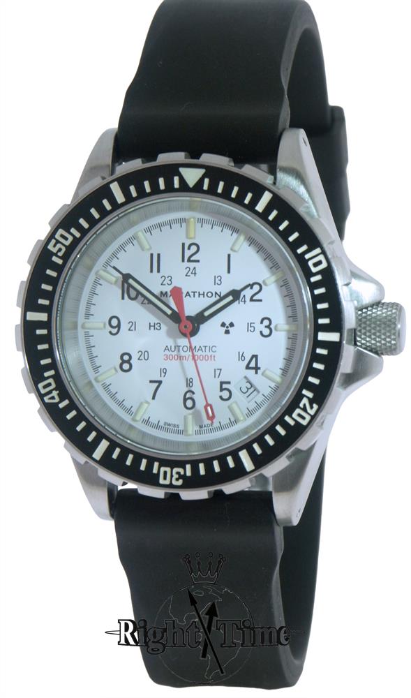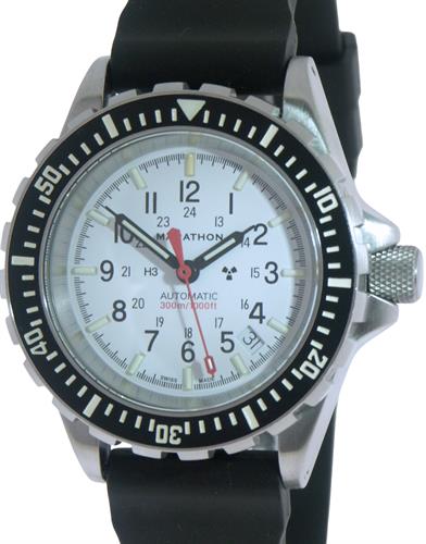 Marathon US Government Diver model WW194006-WD. Swiss made Sellita SW200-1 automatic movement. Solid stainless steel case. Uni-directional bezel with black 60 minute insert. White arctic dial with tritium filled hands and markers. Sapphire crystal. Water resistant to 300 meters. Black rubber strap.