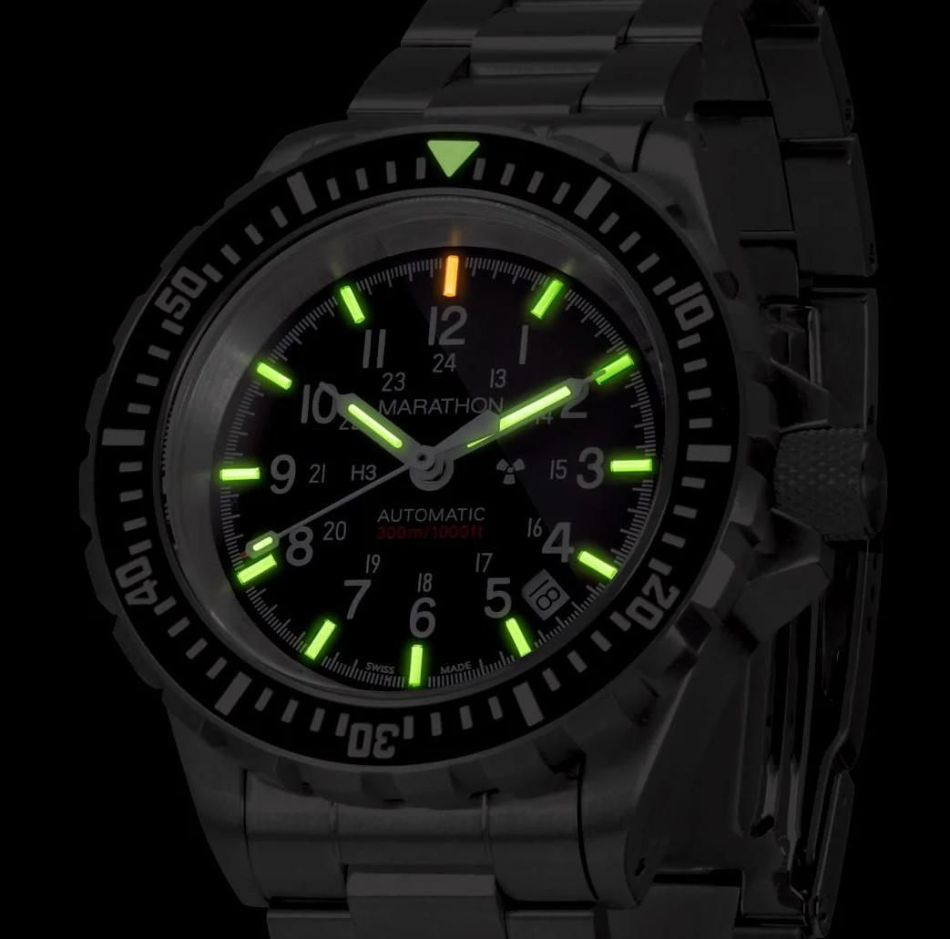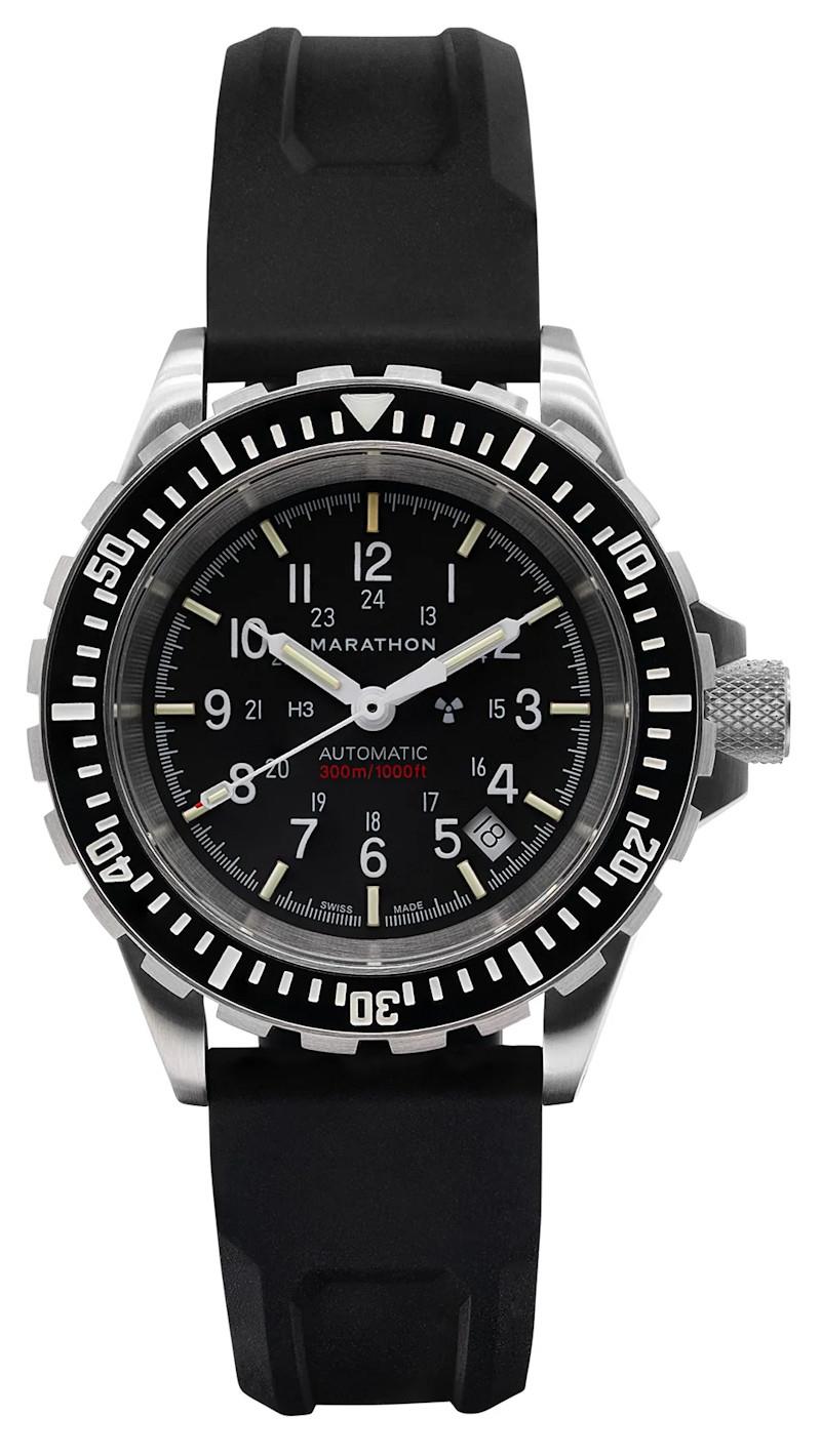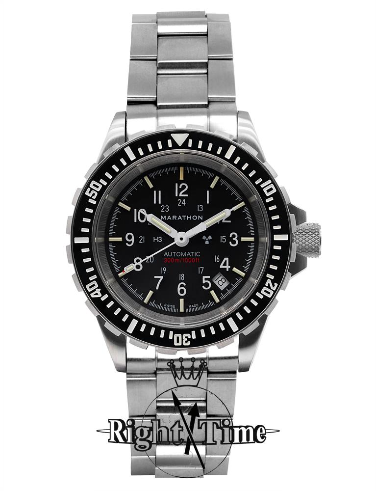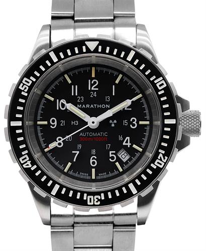 Marathon GSAR Type II diver model WW194006SS-0112. Swiss made Sellita SW200-1 automatic movement with incabloc shock absorber. Solid stainless steel case. Uni-directional bezel with black 60 minute insert. Black dial with tritium filled hands and markers. Sapphire crystal. Water resistant to 300 meters. Comes with a stainless steel bracelet and black rubber strap.