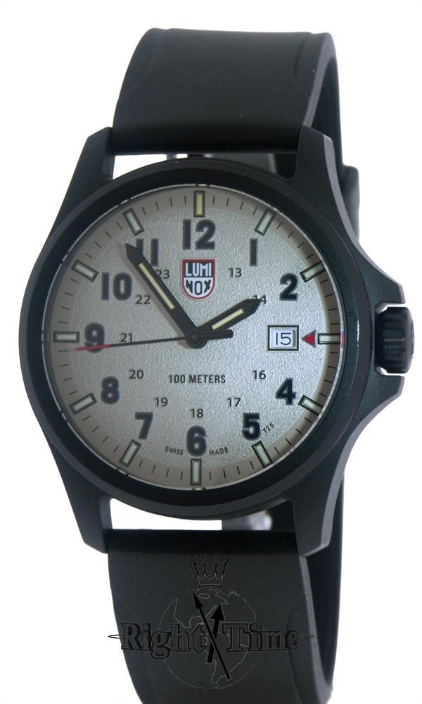 Luminox Atacama Field watch model XL.1971.SET. Inspired by the Atacama Desert. The sand dial design with textured finish and black hour numbers evokes the terrain and rugged landscape of the desert. Black IP CARBONOX case. Swiss quartz movement with date. Sand color dial with Arabic numerals. Comes in a set with black rubber band, green color textile band and a band changing tool.
