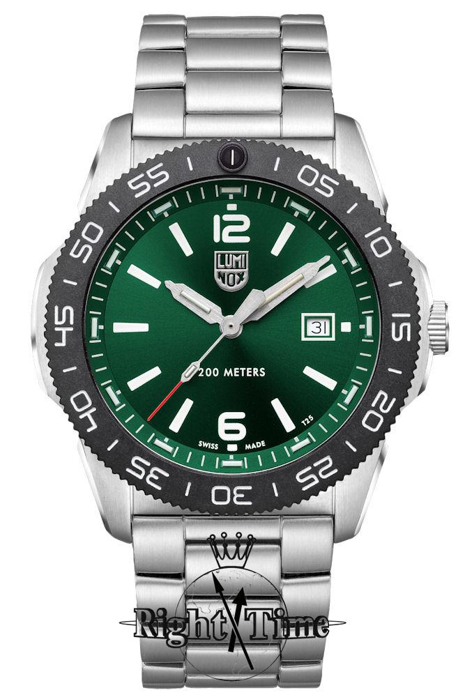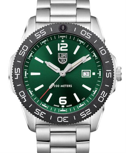 Luminox Pacific Diver model 3137. Swiss made quartz analog movement. Stainless steel case with combination finish. Green dial, black bezel with Arabic numerals. Tritium gas tube filled hands and markers. Uni-directional rotating bezel with 0-60 scale. Scratch resistant sapphire crystal. Steel bracelet. Water resistant to 200 meters.