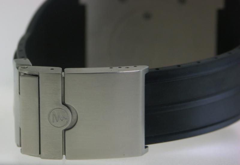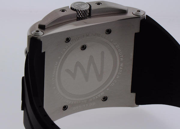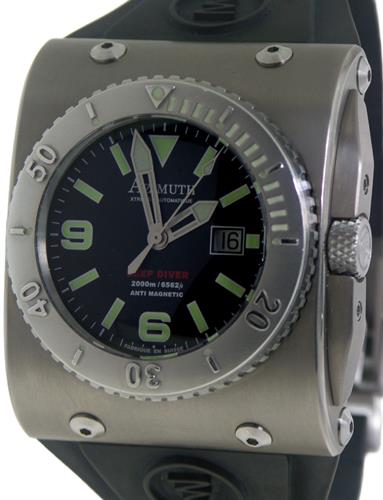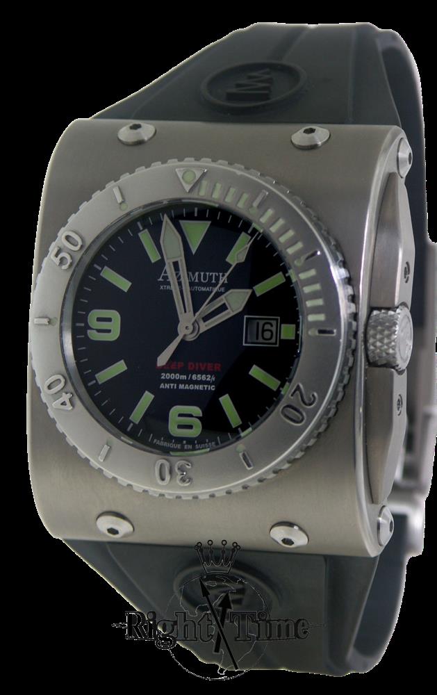Extremely large, but very comfortable Extreme collection diver by Swiss watchmaker Azimuth. Large 56mm case is carved out of titanium, which hosts a modified ETA2826 automatic movement with large date. Black genuine rubber strap with sport style tri-fold clasp. Water resistant to 2000 meters.