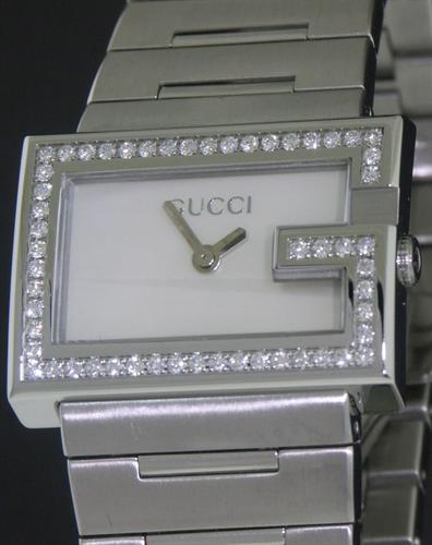 Gucci "G" model 100L polished case with 54 diamonds (0.40ct tw) on the bezel. Satin finish stainless steel bracelet. Genuine mother-of-pearl dial. Swiss quartz movement.