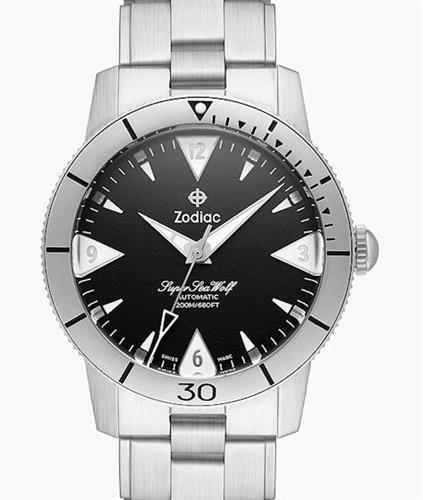 Zodiac Super Sea Wolf 53 Skin Automatic watch model ZO9213. Powered by automatic movement. Stainless steel 316L case and bracelet. Black dial with large luminous glowing orange markers. Rotating bezel. Water resistant to 200 meters.