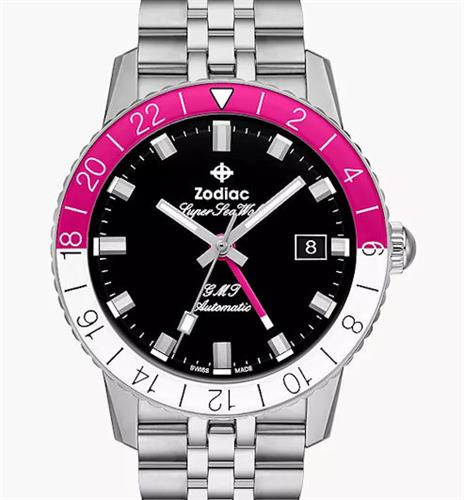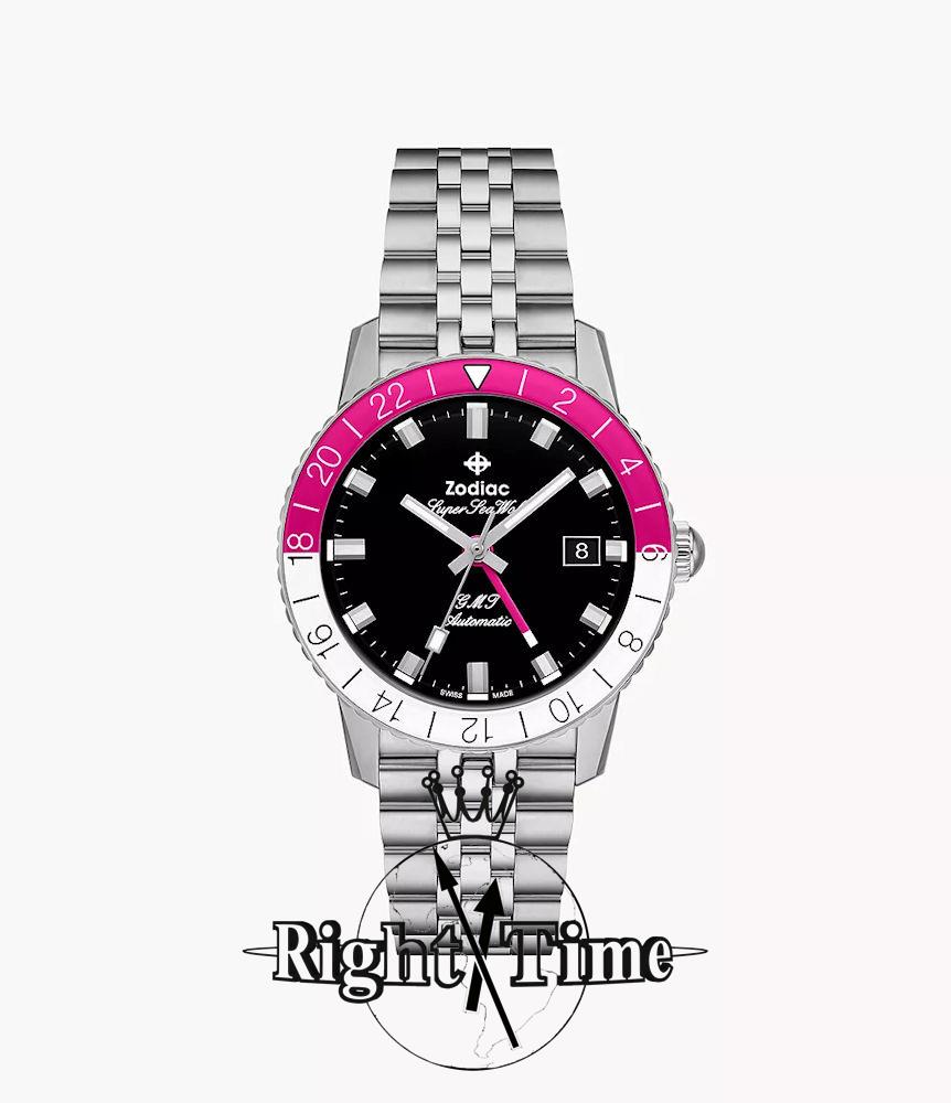 Zodiac Super Sea Wolf GMT Automatic watch model ZO9416. Powered by automatic movement. Stainless steel 316L case with bracelet. Black color dial with date calendar, second time-zone indicator, luminous hands and markers. Rotating 24-hours pink/white bezel. Water resistant to 200 meters.