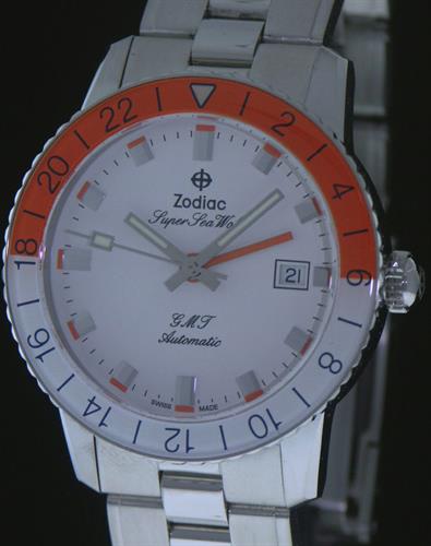 Zodiac "Super SeaWolf GMT" orange sherbet limited edition of 282 pieces. All stainless steel 40mm case and bracelet, powered by ETA 2893-A2 automatic movement with calendar and second time zone indicator, white/orange dial and bezel