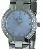 Elegant Concord La Scala model with a Swiss quartz movement in a highly polished stainless steel case with a hand-set diamond bezel. The dial is pale blue mother of pearl with diamond markers.