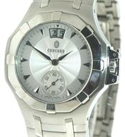 Concord Saratoga Big Date. Based on ETA 2892-2 with Grande Guichet function and small second hand platform. Featuring 26 jewels. Stainless steel case, silver dial, silver second hand sub-dial, steel markers. 50 meters water resistant.