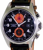 Glycine Combat 07 chronograph powered by ETA/Valjoux 7750 automatic movement. Solid 316L stainless steel case, sapphire crystal and leather watch band with orange color accents and stitching. Gorgeous black dial with contrasting orange sub-dials and tachymeter scale.
