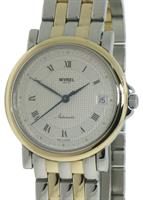 Nivrel Mechanical wrist watch. Swiss ETA 2892-2 Automatic movement with 21 jewels and Cotes de Geneve hand enhancements. Polished finish Solid Stainless steel case with 18kt gold bezel. Ivory Guilloche textured dial with Roman printed numerals and date calendar. Polished finish watch bracelet with a combination of 18 kt Gold and Solid Stainless steel