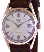 Tissot T12 Visodate model in rose gold cap over stainless steel case. Swiss Automatic ETA movement with day/date. Acrylic crystal. Ivory color dial with rose gold colored index markers. Brown leather band.