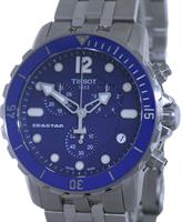 Tissot Seastar 1000 model T120.217.17.011.00. Swiss made quartz analog movement with date and chronograph function. Solid stainless steel case with uni-directional 60 minute bezel. Graded white-grey dial with luminous hands and markers. Sapphire crystal. Water resistant to 30bar. Comes on a white rubber watch strap.