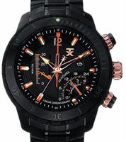 TX watch with second time zone and chronograph with multifunctional retrograde and liner hand functionality from TX Technoluxury 800 Series. Patented quartz 6-hand movement with date. Polished and satin finished black PVD plated 316L steel case and bracelet. Black color dial with luminous hands and markers. Sapphire crystal. One-way rotating black bezel. Water resistant to 100m