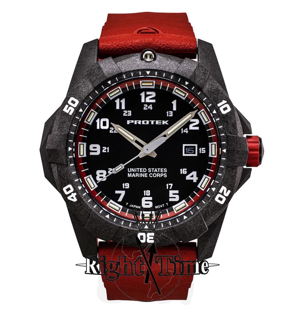 Protek official USMC diver model PT1012R. The official watch of the United States Marine Corps. Japanese made Miyota 2S60 quartz movement with 10 year battery life. Black carbon composite case and bezel with sapphire AR coated crystal. Black dial with red chapter ring. Tritium-tube filled luminous hands and markers. Red rubber strap.