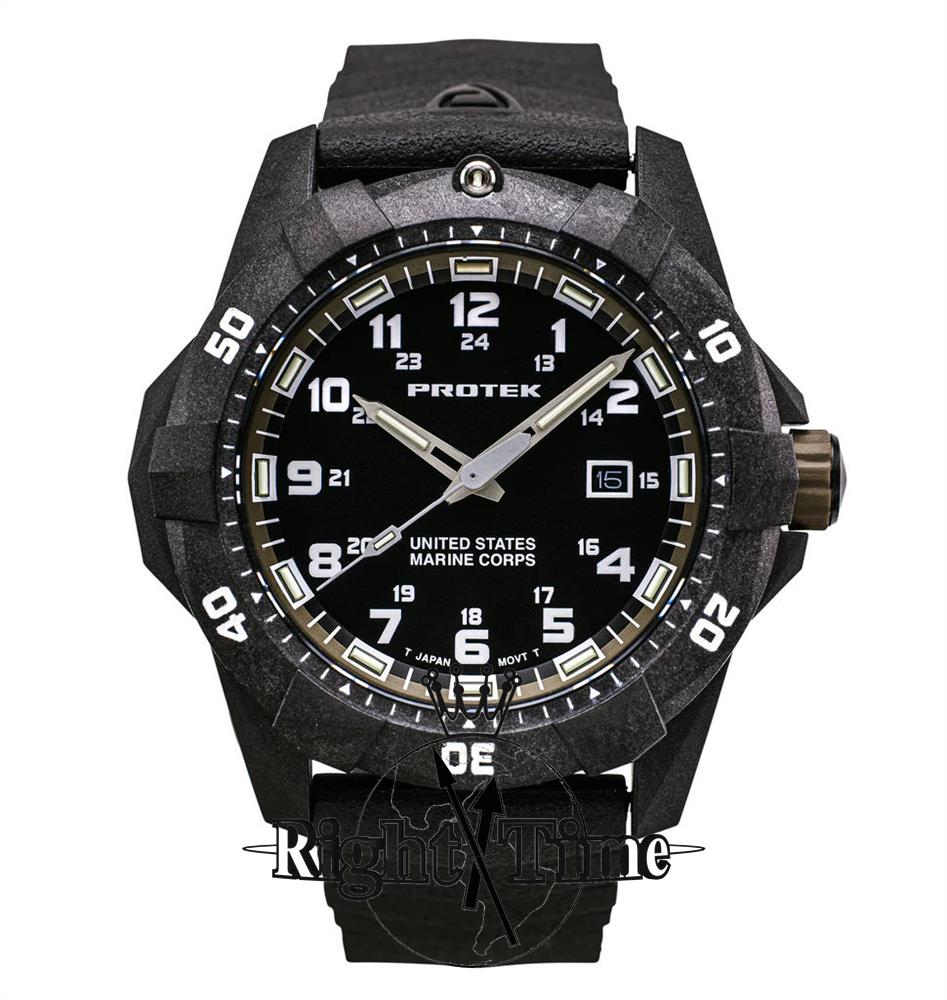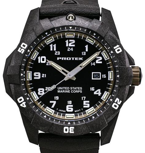 Protek official USMC diver model PT1016. The official watch of the United States Marine Corps. Japanese made Miyota 2S60 quartz movement with 10 year battery life. Black carbon composite case and bezel with sapphire AR coated crystal. Black dial with khaki chapter ring. Tritium-tube filled luminous hands and markers. Black rubber strap.