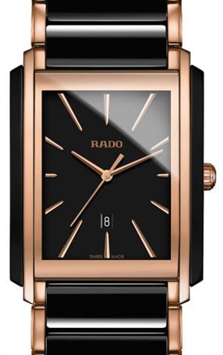 Rado model R20 962 15 2 from Rado Integral collection. Quartz movement, stainless steel/black ceramic case with rose gold accents, sapphire crystal, black color dial with date calendar, combination rose gold plated stainless steel and black high-tech ceramic watch bracelet.