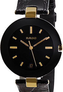Rado model R22 828 15 5 from Rado Coupole collection. Quartz movement, black high-tech ceramic case with gold plated steel lugs, sapphire crystal, black dial, black leather band.