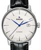 Rado model R22876015 from Rado Coupole Classic collection. Swiss automatic movement, stainless steel case, sapphire crystal, leather strap, white textured dial with date, blue hands and silver tone markers.