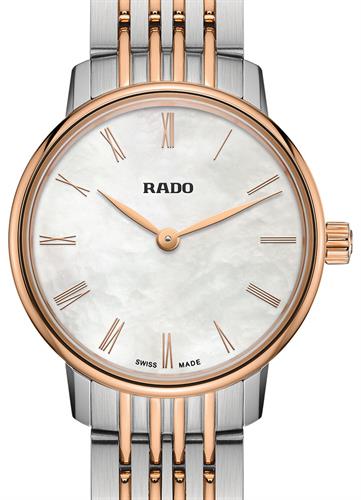 Rado, model R22897933 from the Coupole collection. Combination stainless steel and Rose gold plating on the case and bracelet. Genuine mother-of-pearl dial with polished Rose tone Roman numeral markers. Swiss made Quartz battery powered movement.