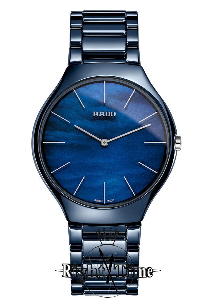 Rado True collection. Inspired by nature and Rado`s partnership with the Grandi Giardini Italiani. 39mm High-tech scratch proof blue ceramic/steel case and bracelet. Sapphire crystal. Blue Mother-of-Pearl dial represents water. Watch is powered by quartz movement