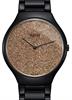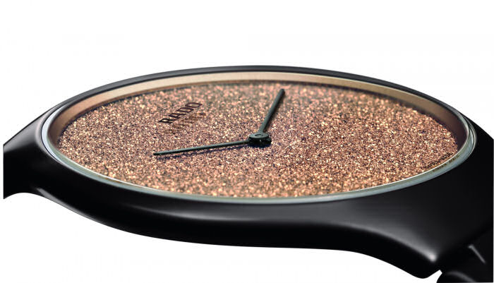 Rado True Thinline collection. High-tech scratch proof black ceramic case and bracelet. Sapphire crystal. Brown "Golden Dust" dial with black hands. Watch is powered by quartz movement