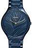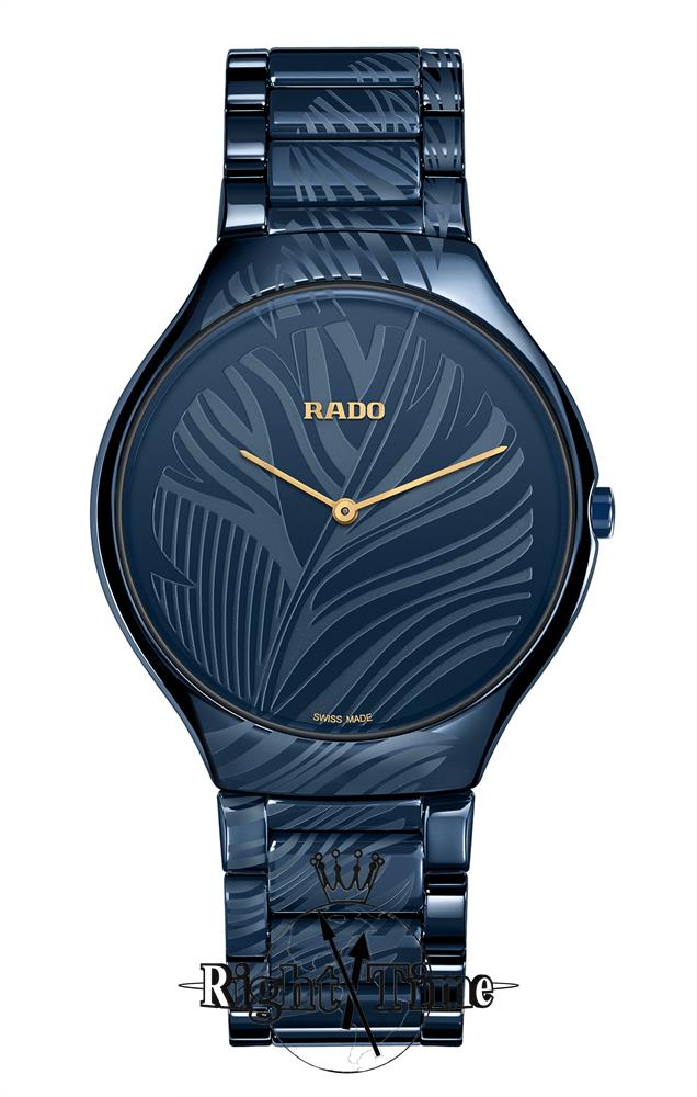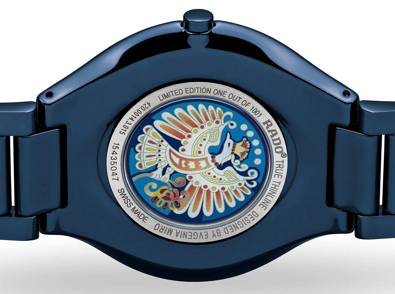 Rado True Thinline "My Bird" Limited edition of 1001 pieces worldwide. Designed by award-winning Russian artist and designer Evgenia Miro, the watch features a precision laser engraving of a delicate feather pattern on the bracelet and the image placed diagonally across the dial. The case and bracelet are scratch resistant ceramic in an opulent blue color. Swiss Quartz analog movement. Sapphire crystal. Factory model R27014152.