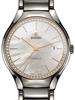 Rado True series model R27057852. Your eye will immediately catch the stunning contrast between the genuine mother-of-pearl dial and polished rose markers and hands. A row of genuine diamonds lines the outer edge of the dial provides a brilliant sparkle from any angle. Plasma high-tech scratch proof silver color ceramic case and bracelet with a mirror polished finish. Sapphire scratch resistant crystal. Powered by a Swiss made automatic movement.