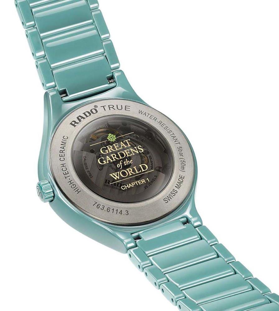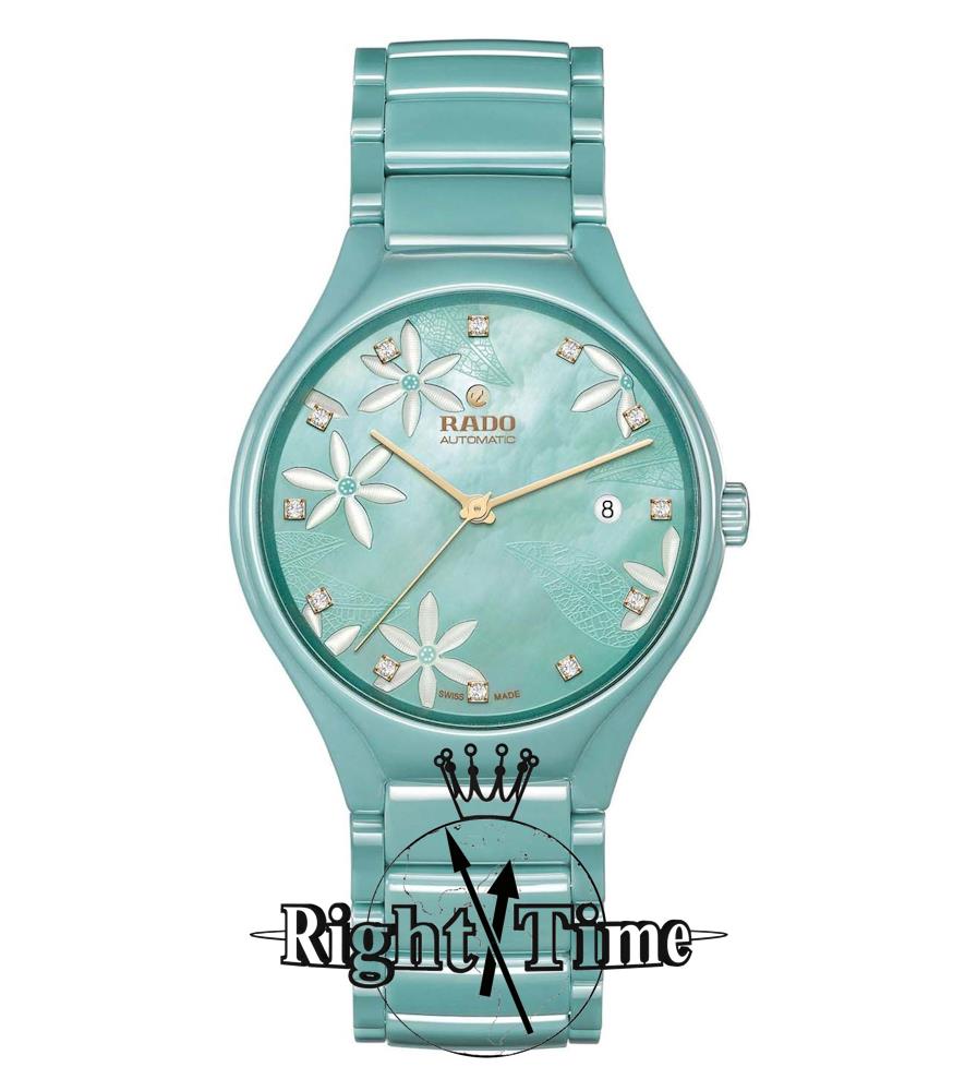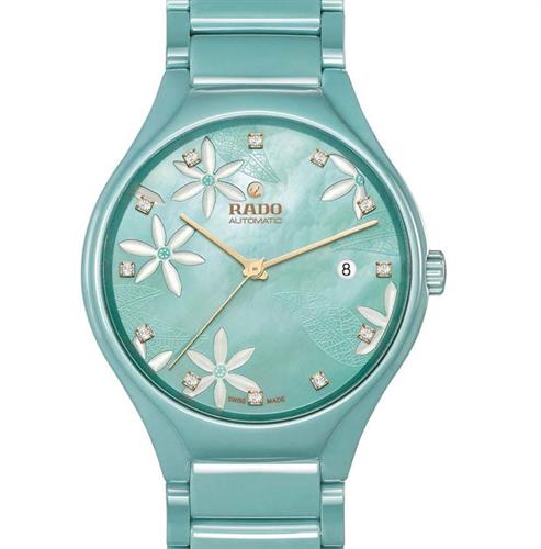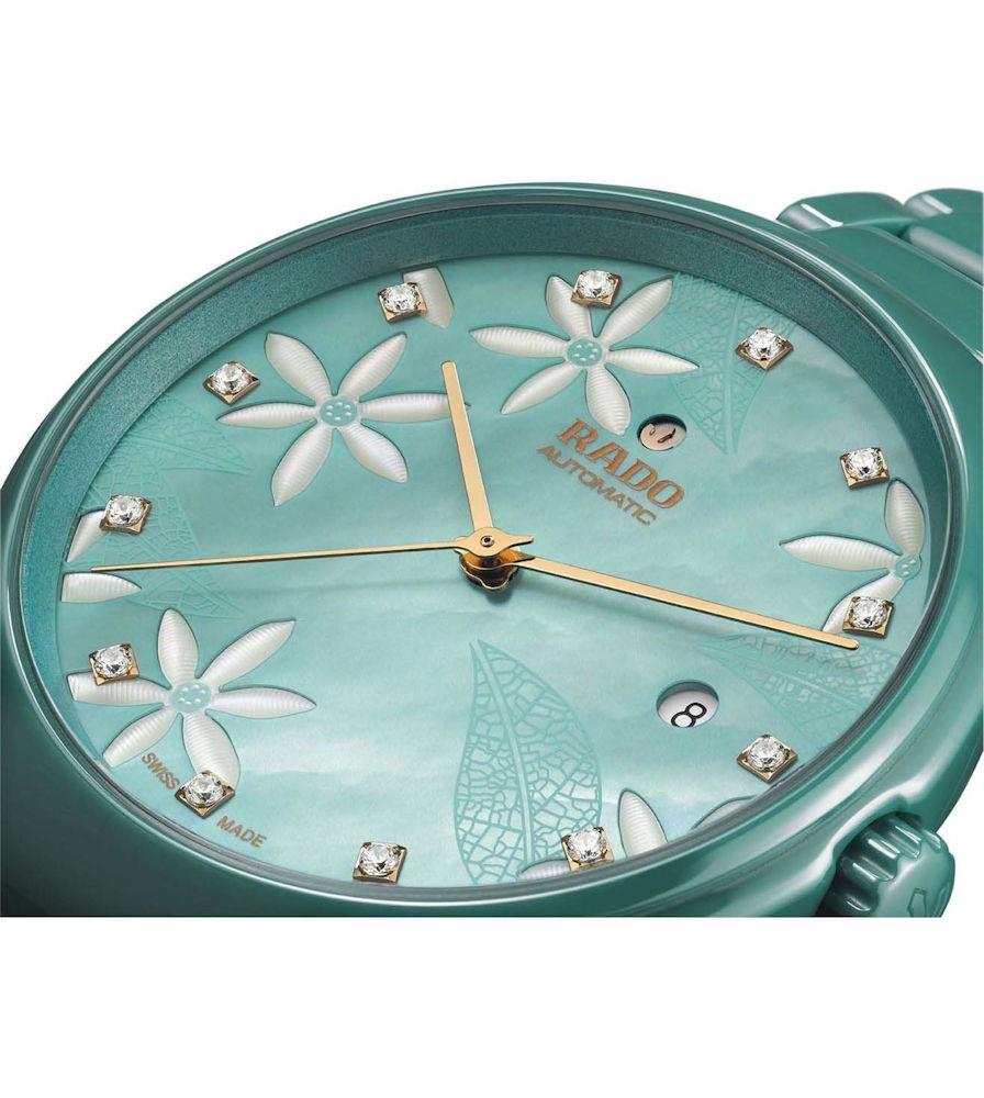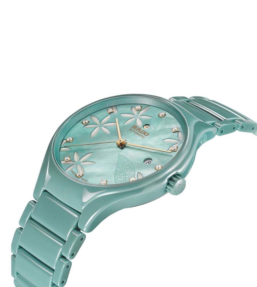Rado True Great Gardens of the World, model R27114902. Swiss automatic movement. The case and band are made of solid scratch resistant ceramic in a teal color. Sapphire crystal. Mother-of-Perl dial decorated with jasmine flowers, diamond markers, and date calendar.
