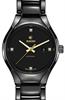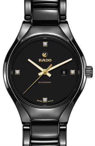 Rado True collection model R27242712. High-tech scratch resistant black ceramic case and bracelet. Sapphire crystal. Black dial with gold tone hands and genuine diamond markers. Powered by a Swiss made ETA automatic movement.