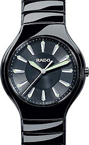 Rado True Elegance collection. Shiny high-tech scratch proof black ceramic case and bracelet. Sapphire crystal. Black dial with luminous markers. Watch is powered by quartz movement
