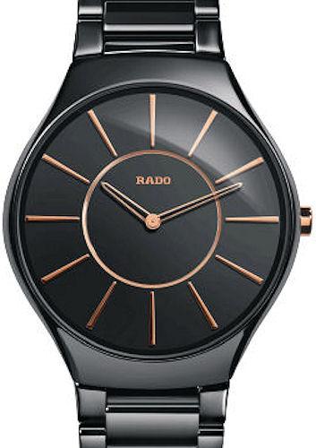Rado True Thinline collection. High-tech scratch proof black ceramic case and bracelet. Sapphire crystal. Black dial with rose gold tone hands and markers. Watch is powered by quartz movement